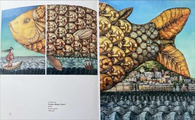 特に印象深かったのは、名古屋の日本人シェフのお話でした。真冬の寒さの中、「今、あなたの家の前に来ている」というメッセージが唐突に入り、慌てて戸口に出てみると、「絵を買いたい。自分は金持ちではないから、これで買える絵を見せてほしい。」と言って、握りしめていたドル札を差し出したそうです。いくつかの作品を見せるうち、金色の魚の頭、胴体、尻尾を3分割して描いた作品が大変お気に入った様子。持参した現金ではそのうち1枚しか買えないので、とりあえず頭の絵を買って帰ったそうです。今でも時々、「尻尾の絵も必ず買いたい。まだ取り置いてくれていますか。」と確認の連絡が来ており、彼が尻尾の絵を買いに来る日を楽しみにしていると話していました。カタログを見ると、その尻尾の絵の背景にはウラジオストクの街が描かれています。いつの日か、この3部作がそろった名古屋の店を訪ねることができたら素敵だろうなと想像しています。