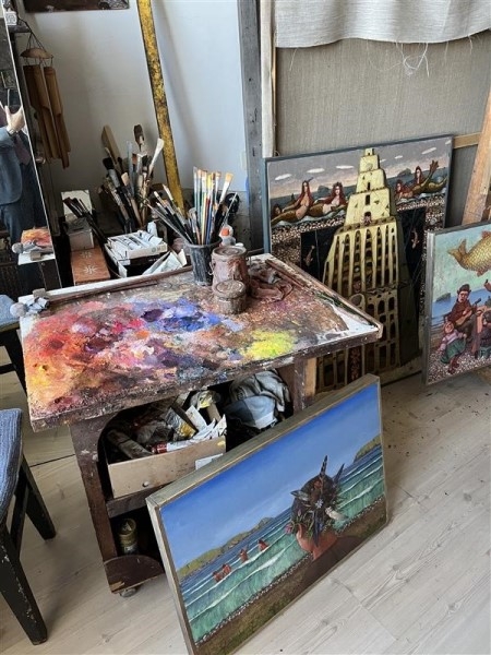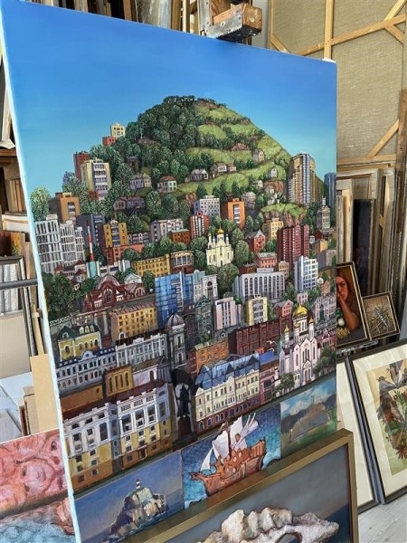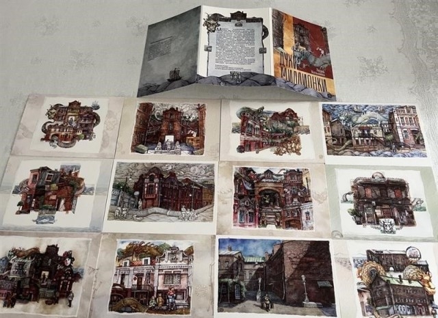 知人からもらった絵はがきセットに、かつてウラジオストクの中国人街だった「ミリオンカ」が描かれていました。龍のイメージとともに、当時の街角を描き出す作風に強く興味を惹かれました。当地在住の女性画家リディア・コズミナさんの作品です。そこで、思い切ってお願いして、リディアさんのアトリエにお邪魔させて頂きました。ソ連時代、地元の芸術家達に無償で提供された部屋を、今もアトリエとして使っておられます。9階建ての最上階にあり、サイズの大きな作品も制作できるよう天井の高い構造でした。1つの階に3つのドアがあり、いずれも芸術家がアトリエとして使っているそうです。「ここはウラジオストクの芸術村ですね」と言うと、笑って頷いてくれました。
