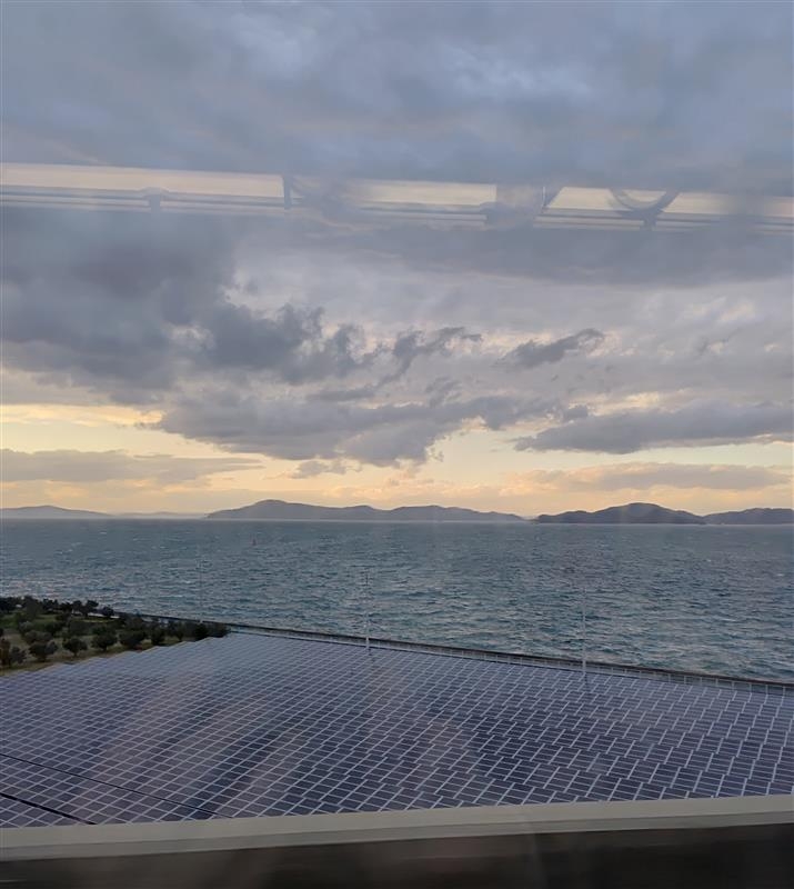 岡山に向かう車窓から: 瀬戸内海の夕日