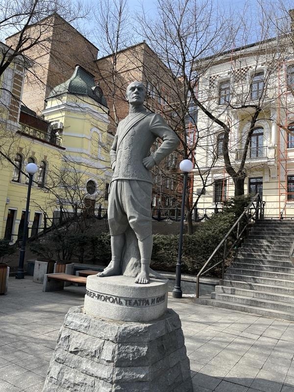 Памятник Юлу Бриннеру: жёлтое здание слева – офис компании FESCO, справа – особняк Бринеров
