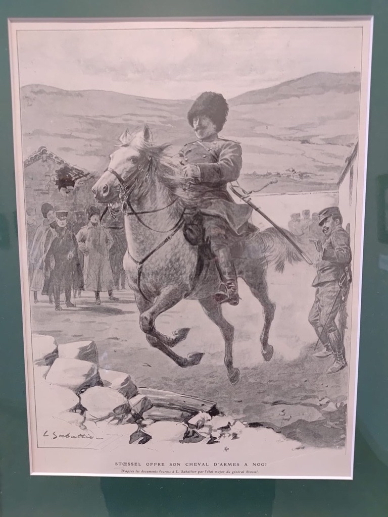 Если пройти вглубь галереи, то можно найти небольшую часть экспозиции с гравюрами, посвященными Русско-японской войне и коренным народам Сибири и Дальнего Востока. Среди представленных там работ я обратил внимание на одну, изображающую величественную фигуру генерала-лейтенанта Анатолия Стесселя, которого в своём произведении «Облака над холмами» описывает Рётаро Сиба. Судя по всему, воевавшие в Порт-Артуре генерал Ноги Марэсукэ и Анатолий Стессель проявляли рыцарский дух, характеризующийся взаимным уважением. Стессель был приговорен к смертной казни за преждевременное решение о капитуляции, однако Ноги Марэсукэ ходатайствовал императору Николаю II о помиловании Стесселя. По рассказам, после отмены приговора Стессель, узнав о кончине Ноги Марэсукэ, анонимно отправил подарок его семье в знак соболезнования. Рассматривая гравюры и представляя себе суровый климат и сложный ландшафт Дальнего Востока, я размышлял об истории межличностных взаимоотношений, сложившейся между нашими странами.