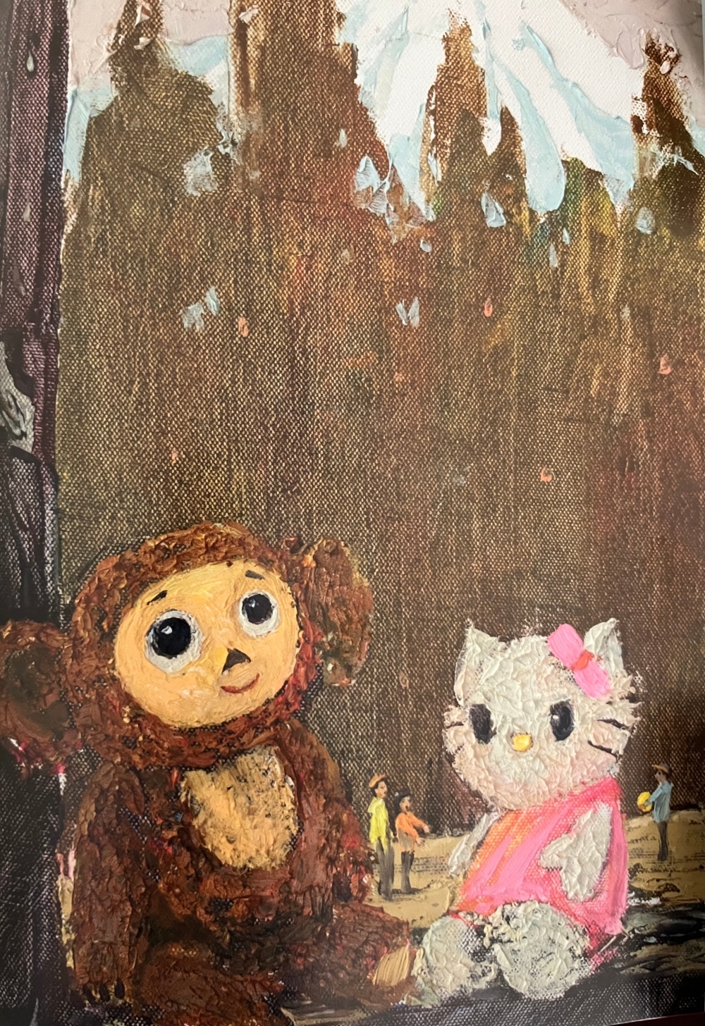 В альбоме-каталоге, который мне подарил в качестве сувенира Игорь Обухов, была работа под названием «Друзья. Фудзигоко». На ней Чебурашка и Китти мило стоят рядом на фоне горы Фудзи. Лично мне эта картина понравилась больше всего.