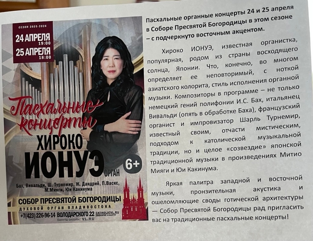 Как оказалось, на следующий день после моей встречи с отцом Мироном в стенах прихода Пресвятой Богородицы был запланирован концерт органистки Иноуэ Хироко, на который меня любезно пригласили. Родом из Осаки, она впервые познакомилась с органом во время обучения на фортепианном факультете Московской государственной консерватории, на протяжении многих лет работала органистом-солисткой в Калининградской областной филармонии и продолжает выступать в разных регионах. В программе наряду с европейскими произведениями, И. С. Бахом и другими, прозвучали произведения японских композиторов Мияги Митио и Какинума Юи. Я до глубины души поражён тем, как одна встреча может поднять историю о череде событий, проходящей через века, и связывающей Японию, Витебск, Калининград и Владивосток.